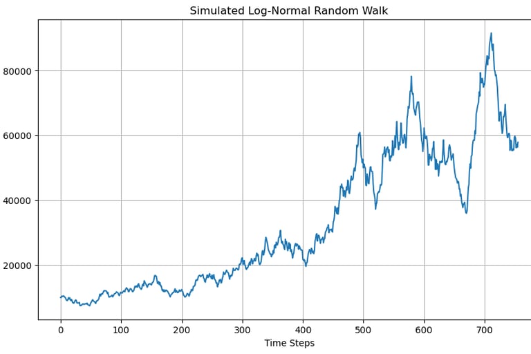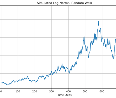 Mean of returns scale with time larger is the time step larger is the mean and Standard deviation of returns scale with square root of time. Thus change in price of stock can be written as Si - Si-1 = Si-1(ยตdt + ๐๐โdt). This equation represents a stochastic process that follows a log normal random walk. A realization of which is shown in below image. ยต is the drift term which represents the expected rate of return of the asset over time. ยต defines the direction in which price of the asset is headed to. ๐๐โdt represents the randomness involved with asset prices together mu and sigma define the overall behaviour of price of the asset. Stochastic modelling plays a very vital role in Quantitative finance as most financial instruments involve some degree of randomness and to make a informed decision it becomes imperative to model the randomness.