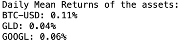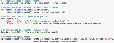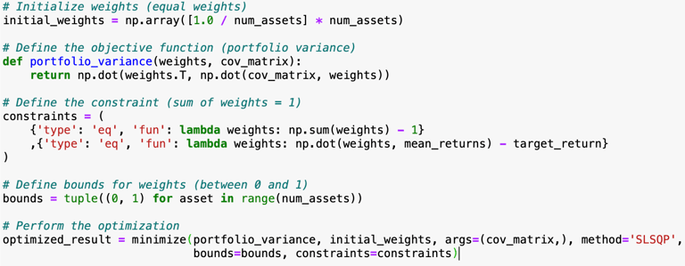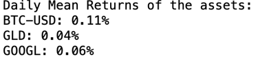 Considering closing price data of following assets Google Stock, Bitcoin and Gold for period Jan 2022 to June 2024. Mean Daily Returns of the above assets are as follows Google 0.06% , Bitcoin 0.11% and gold 0.04%. Our goal here is to create a portfolio with Targeted Mean Daily return of 0.08% while keeping the volatility as low as possible. Based on above data and our Target return of 0.08% Mean Variance Optimization technique resulted in following weights for each asset class Bitcoin - 52% , Gold 20% and Google stock 28% with volatility of 2.1%. Note I made use of SLSQP (Sequential Least Squares Programming) algorithm involves the linearization and quadratic approximation of the objective function and constraints.