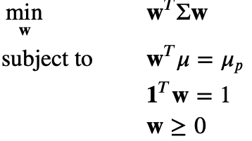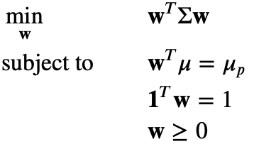 Objective Function: Typically to minimize the portfolio variance 𝞼p^2 subject to a constraint on the expected return.