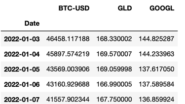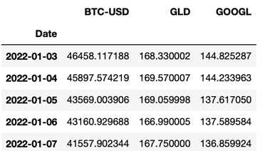 Step 1: Creating Dataframe for 3 asset classes (Google Stock , Gold, Bitcoin)
