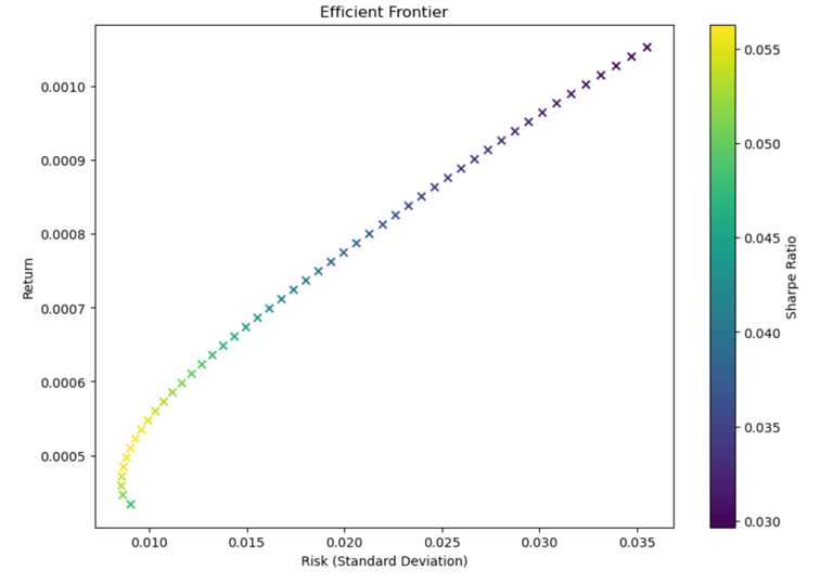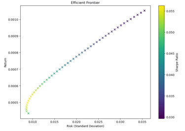 We can also choose target return based on given level of risk using efficient frontier. The efficient frontier is a key concept in portfolio theory that represents the set of optimal portfolios offering the highest expected return for a given level of risk (standard deviation), or equivalently, the lowest risk for a given level of expected return. Below diagram represents the efficient frontier for all the above assets that we have considered. Risk- Reward relationship of higher the risk higher is the reward can be clearly observed from the efficient frontier. As risk increases, the additional expected return gained from taking on more risk may not be sufficient to compensate for the increased risk. This results in a lower Sharpe ratio. This is also very evident from the efficient frontier